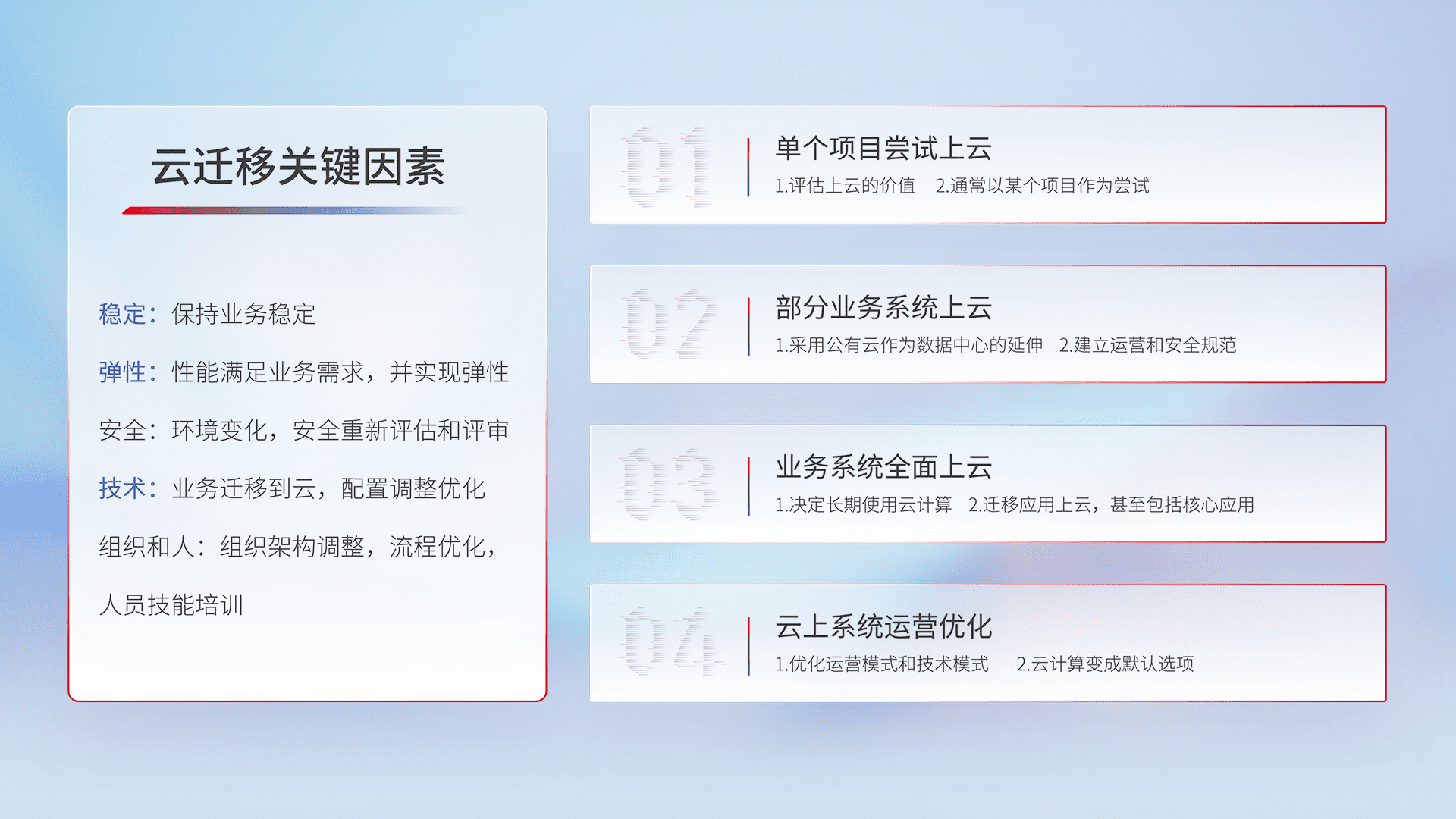 结合实际业务,,,从规划设计、、、云平台选型、、云原生改造、、、数据迁移、、、集成交付,,迁移全过程为客户识别最佳上云路径,,做好风险识别管理,,,,设计网络架构、、、、身份权限、、、、安全审计合规、、操作审计、、、日志审计、、、监控告警策略、、多站点容灾设计等,,,对云上基础设施进行整体规划,,,,提升IT治理水平,,,,以满足弹性、、高可用、、、、高性能的需求。。