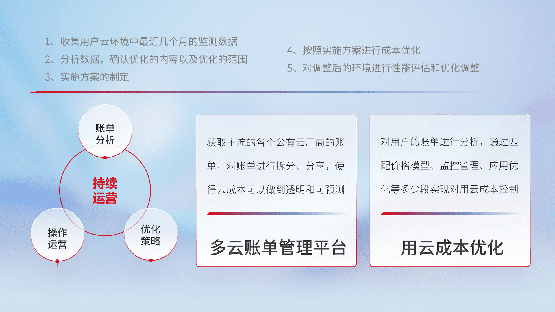 通过多云纳管,,,以统一的资源数据模型把客户的云资源进行抽象和封装,,,进而实现对多云资源的统一操作,,,,保障云资源管理的可靠性、、、、稳定性与可用性。。。。量身定制化运维内容,,配置、、开发运维、、、补丁管理、、、备份、、、监控、、、、认证和访问管理、、审计和日常巡检等,,,保障在用云过程中的可靠度,,,,稳定度以及高可用率。。。。