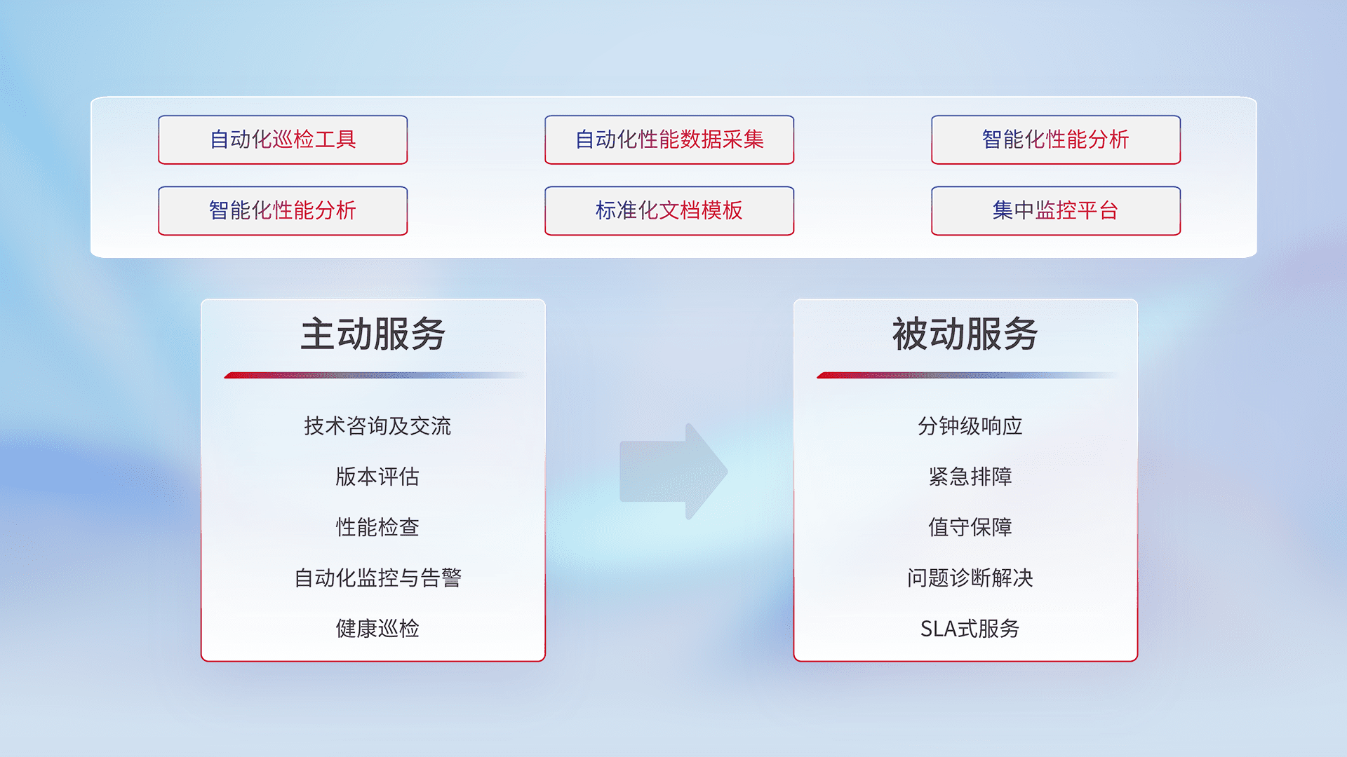 智能化工具和标准化文档,,,保障服务质量,,,,提供主动服务(包含技术咨询、、版本评估、、、、性能检查、、自动化监控与告警、、、健康巡检)和被动服务包含(分钟级响应、、、、紧急排障、、值守保障、、问题诊断解决、、SLA服务)。。