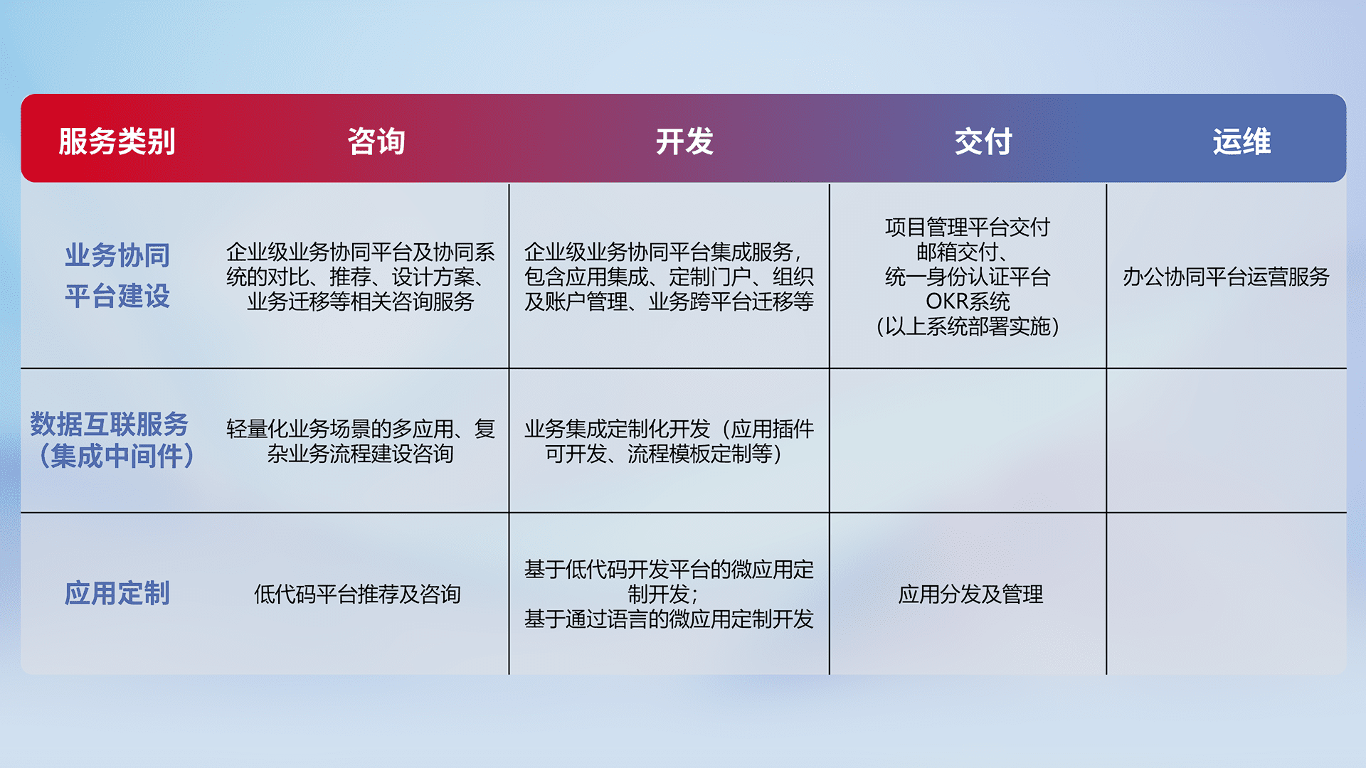 针对钉钉、、企微、、IDaas等平台级产品提供产品的规划、、、方案、、、、交付、、、、定制化开发等服务,,实现如统一协同办公、、智能客户服务、、、、混合会议管理、、、智能数据查询、、、等业务场景,,,实现数字化转型。。